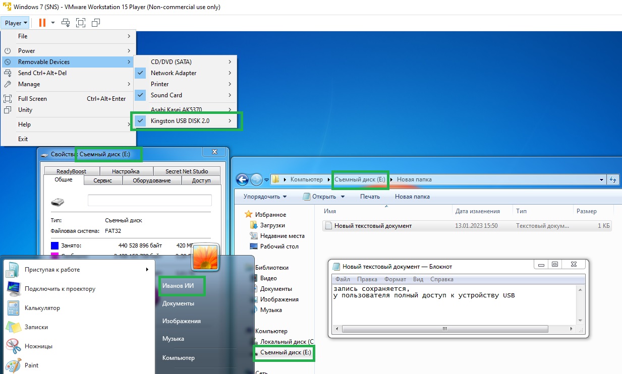 - Выполнена проверка доступа к USB-накопителям под учетными записями пользователей с различными правами: