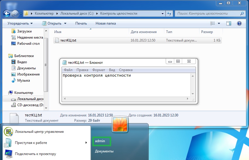 - Создан текстовый файл C:\Контроль целостности\текстКЦ.txt для проверки механизма КЦ (Рис 1.)