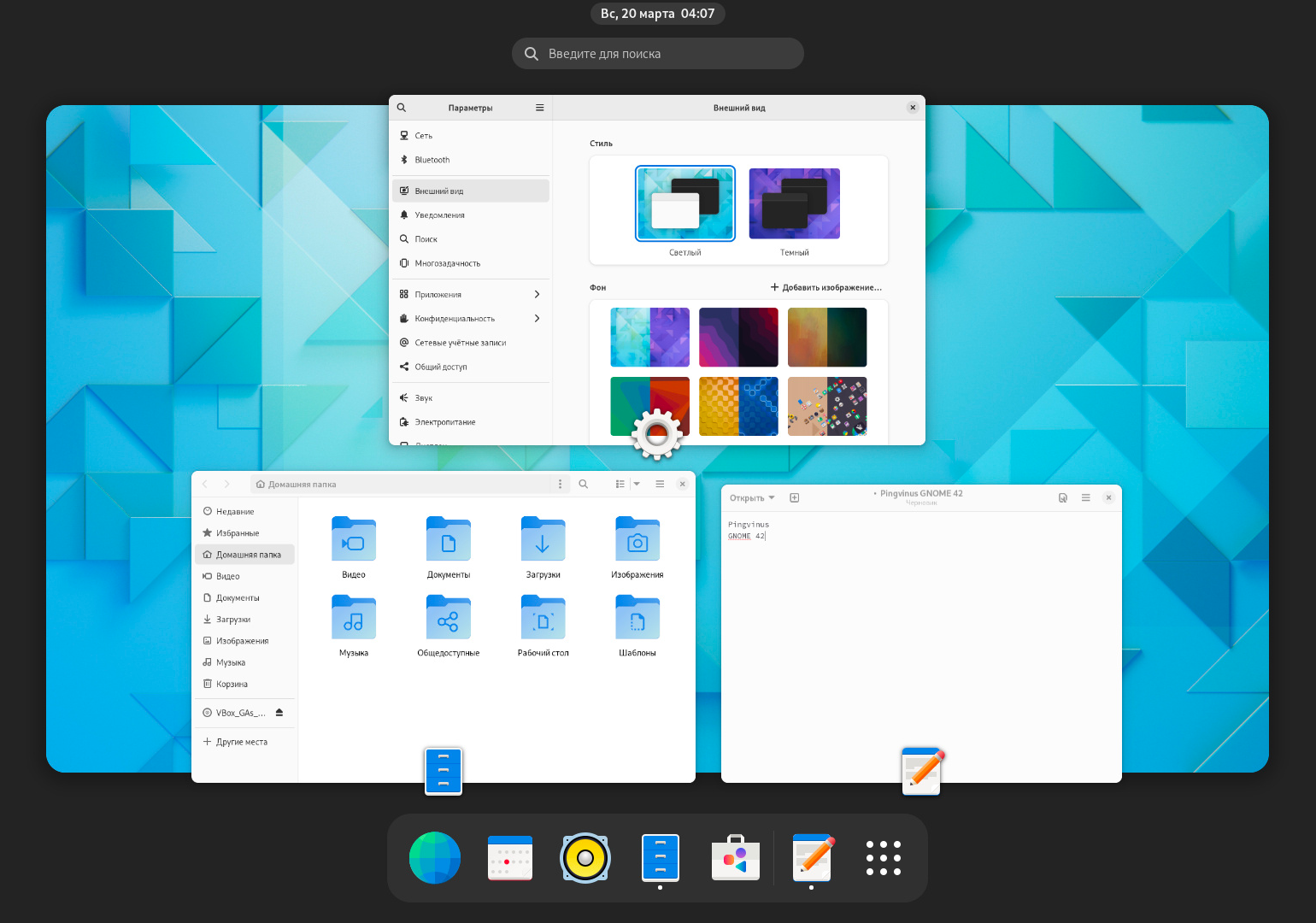 Среда рабочего стола. Всё, что вы видите на экране при работе с системой: файловый менеджер, окна, обои, статус-бары, панели задач и другие инструменты. Чаще всего в дистрибутивах Linux используется среда GNOME, пришедшая из вышеупомянутой GNU.