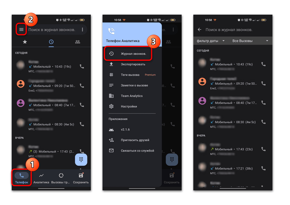Тапните по трем горизонтальным точкам на вкладке «Телефон», затем выберите пункт «Журнал звонков». Откроется окно с историей вызовов, которую можно отфильтровать по типу звонка и период дат.