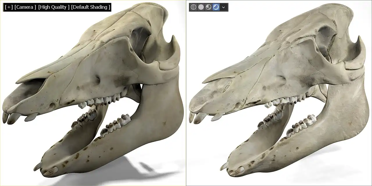 One might say that this particular 3d model of an animal’s skull with coarse dry bone surface material is not the best subject for photorealism testing. And I don’t think that’s right, because we actually had a bright object on a white background without the ability to emphasize the shape of the contours with a contrasting background or bright glossy highlights. So the work was done almost entirely with the play of light and shadow. This is a very difficult situation. The simpler the object, the more trickier you have to be as a 3d artist to make it look real. And both renders did their job pretty well, of course, V-Ray did it noticeably better.