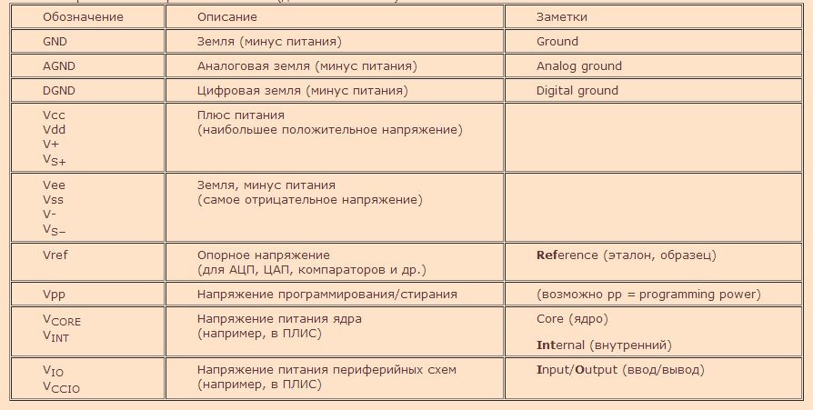 Каждый человек увлекающийся электроникой сталкивается с материалами иностранного происхождения. И будь то схема электронного устройства или спецификация на чип, там могут встречаться множество различных обозначений цепей питания, которые вполне могут ввести в замешательство начинающего или незнакомого с этой темой радиолюбителя. В интернете достаточно информации чтобы внести ясность в этот вопрос. Далее кратко изложено то что было найдено о происхождении обозначений и их применении.