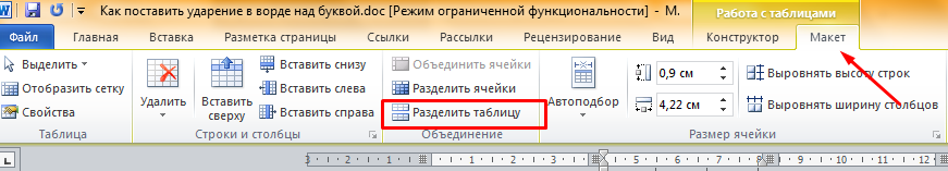 После выделения необходимой строки, следует перейти во вкладку «Макет» и в разделе «Объединение» выбрать пункт «Разделить».