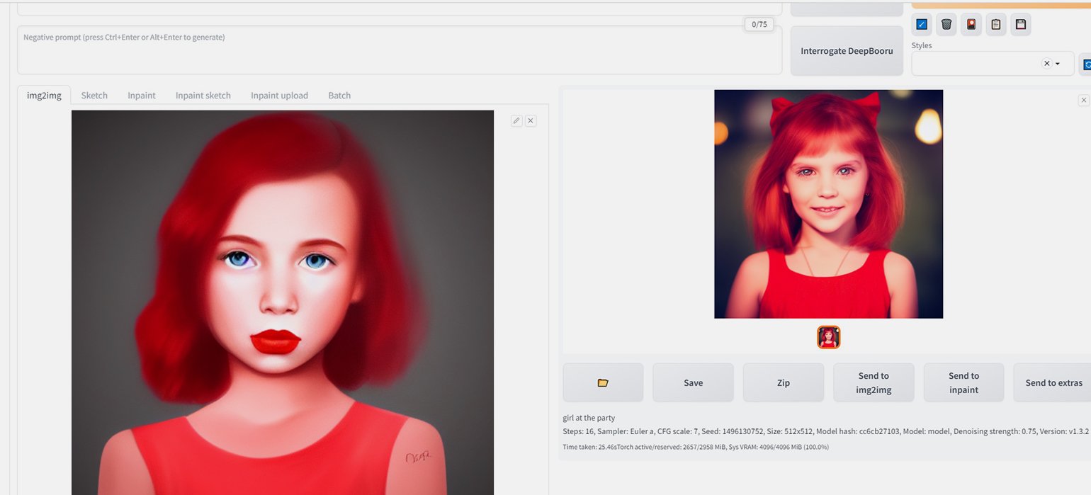 Img2img. Первый инструмент просто перерисовывает загруженную картинку с учётом текстового запроса. Слева референс, справа результат, промпт «girl at the party»: