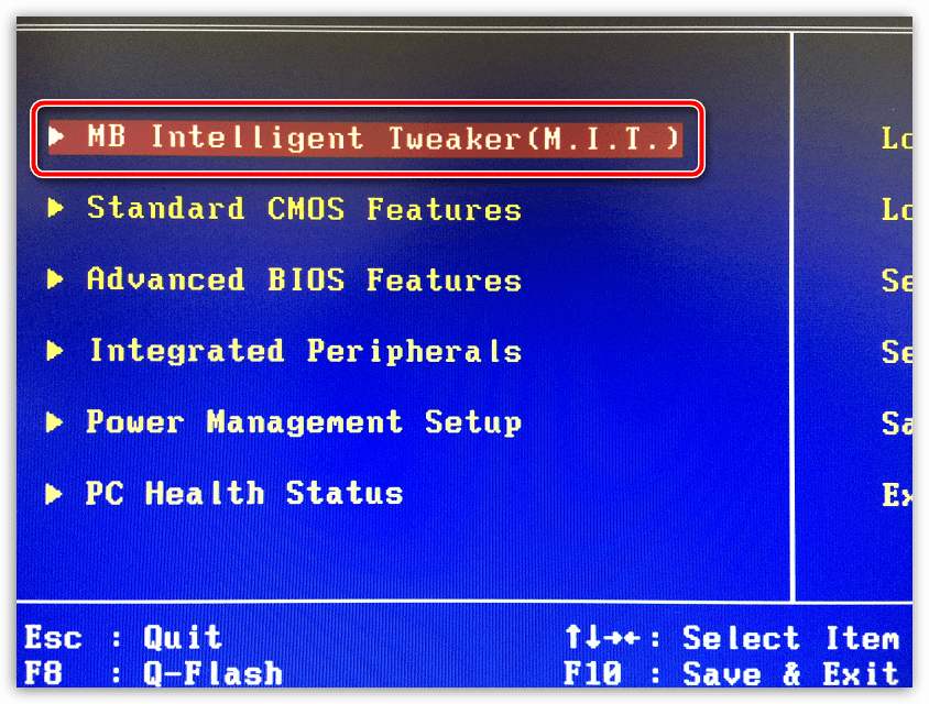 - В появившемся меню найдите один из этих пунктов – «MB Intelligent Tweaker», «M.I.B, Quantum BIOS», «Ai Tweaker». Расположение и название напрямую зависят от версии БИОСа. Для перемещения по пунктам используйте клавиши со стрелочками, для выбора клавишу Enter.