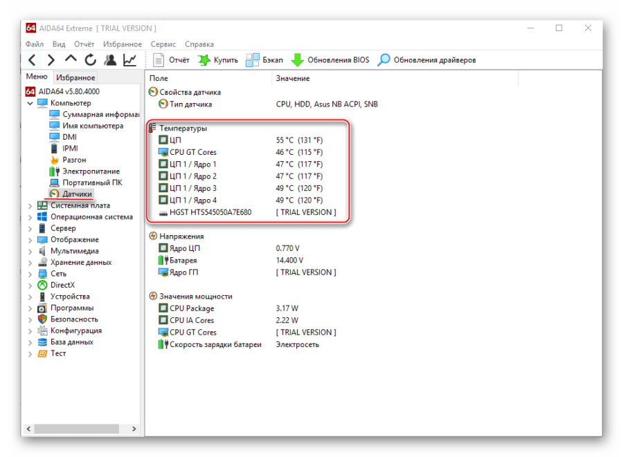 - Запустите программу, нажмите на иконку «Компьютер». Её можно найти либо в левой части окна, либо в центральной. После перейдите в «Датчики». Их расположение аналогично с «Компьютер».